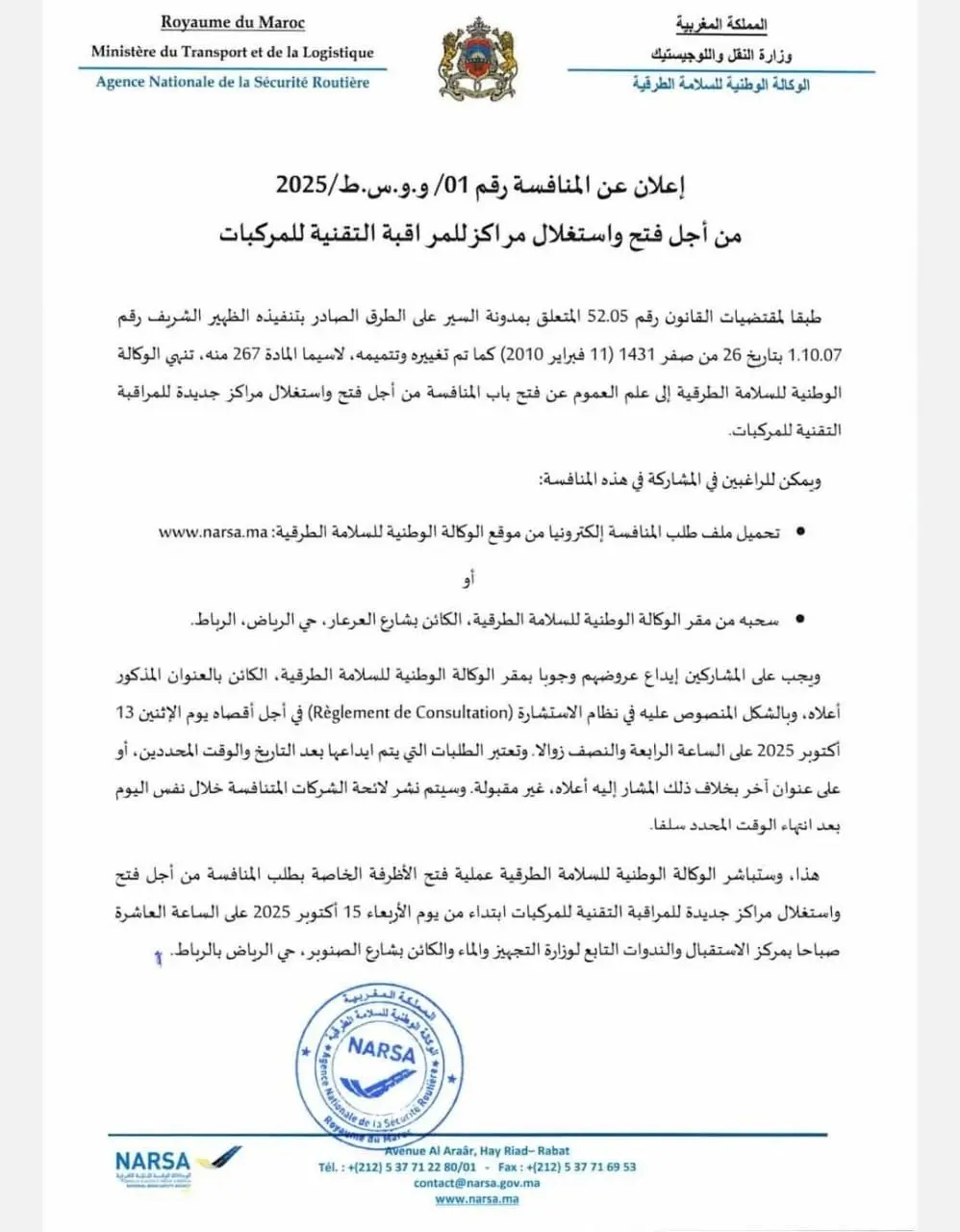 En tant que futur rallié DEKRA, vous bénéficiez de toute l’expertise d’un leader mondial du contrôle technique, présent dans plus de 60 pays et reconnu pour son savoir-faire et la qualité de ses services. Pour vous guider dans vos démarches, nous mettons à votre disposition le Règlement de Consultation (RC) et le Cahier des Prescriptions Spéciales (CPS) de l’appel d’offres de la NARSA. Ces documents sont essentiels pour comprendre les conditions de participation et préparer un dossier conforme aux exigences réglementaires.